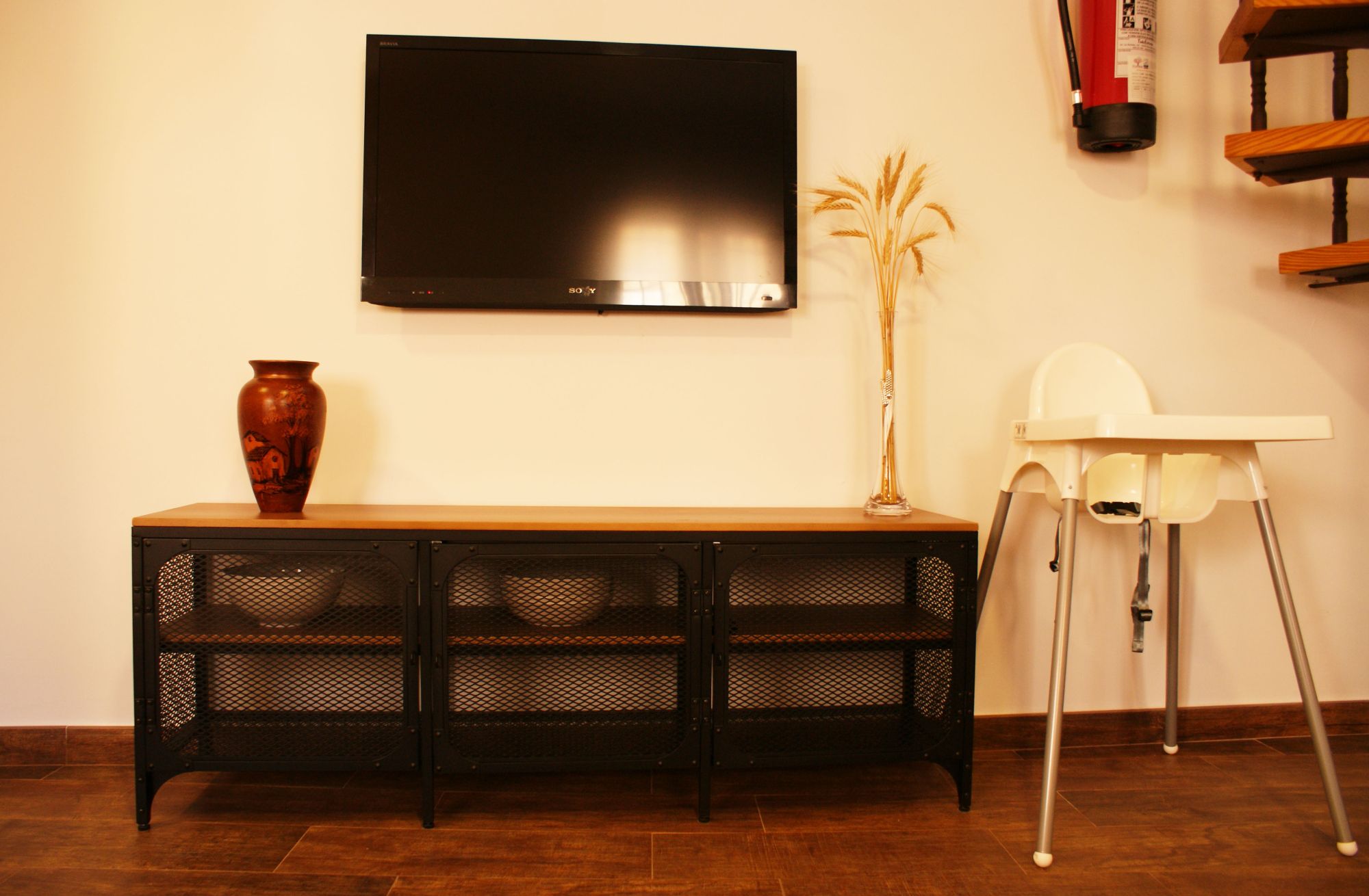 Planta baja con comedor-cocina equipado con sofá-cama, televisor y en la zona de cocina vitrocerámica, lavavajillas, microondas, frigorífico, cafetera de cápsulas e italiana, tostadora, batidora, y todo el menaje necesario para pasar una cómoda estancia en familia o con amigos.